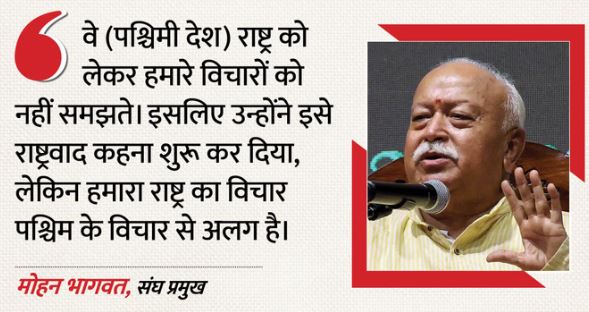 मोहन भागवत ने कहा कि भारत का राष्ट्रवाद का विचार बुनियादी तौर पर पश्चिमी व्याख्या से अलग है। उन्होंने कहा ‘वे (पश्चिमी देश) राष्ट्र को लेकर हमारे विचारों को नहीं समझते। इसलिए उन्होंने इसे राष्ट्रवाद कहना शुरू कर दिया, लेकिन हमारा राष्ट्र का विचार पश्चिम के विचार से अलग है। ये एक देश है या नहीं… हमारे बीच इसे लेकर कोई मतभेद नहीं हैं। हम मानते हैं कि ये एक राष्ट्र है, जो प्राचीन समय से मौजूद है।’ भागवत ने कहा, ‘हम राष्ट्रीयता शब्द का इस्तेमाल करते हैं, राष्ट्रवाद का नहीं। देश को लेकर बहुत ज्यादा गर्व दो विश्वयुद्ध करा चुका है, इसलिए कुछ लोग राष्ट्रवाद शब्द से डरते हैं। भारत का राष्ट्रीयता का बोध गर्व और अहंकार से नहीं निकला बल्कि गहन आत्मचिंतन और प्रकृति के साथ सहअस्तित्व से निकला है।’