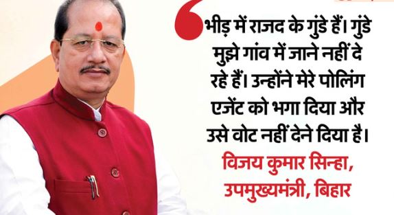 वहीं, इस घटना को लेकर उपमुख्यमंत्री और लखीसराय निर्वाचन क्षेत्र से भाजपा उम्मीदवार विजय कुमार सिन्हा ने बयान दिया है कि भीड़ में राजद के गुंडे हैं। गुंडे मुझे गांव में जाने नहीं दे रहे हैं। उन्होंने मेरे पोलिंग एजेंट को भगा दिया और उसे वोट नहीं देने दिया है। खुड़ियारी गांव के 404 और 405 बूथ नंबर हैं। सिन्हा ने आगे यह भी कहा कि उनको पता है कि एनडीए सत्ता में आ रही है इसलिए उनकी छाती पर बुलडोजर चलेगा।