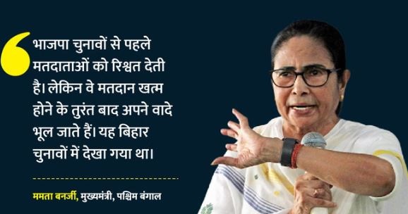 पूर्वी बर्धवान जिले के खंडाघोष में एक रैली को संबोधित करते हुए ममता बनर्जी ने दावा किया कि अगर भाजपा राज्य में सत्ता में आई तो वह पश्चिम बंगाल के लोगों से सब कुछ छीन लेगी। उन्होंने कहा, “भाजपा चुनावों से पहले मतदाताओं को रिश्वत देती है। लेकिन वे मतदान खत्म होने के तुरंत बाद अपने वादे भूल जाते हैं। यह बिहार चुनावों में देखा गया था।”
