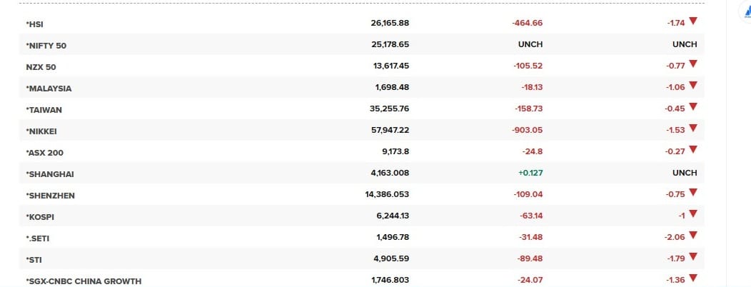 अन्य एशियाई बाजारों में भी बिकवाली का दबाव देखा गया। जापान का निक्केई 225 सूचकांक 1.55 प्रतिशत गिरकर 57,930 के स्तर पर आ गया, सिंगापुर का स्ट्रेट्स टाइम्स सूचकांक 1.86 प्रतिशत गिरकर 4,903 के स्तर पर आ गया, हांगकांग का हैंग सेंग सूचकांक 2 प्रतिशत से अधिक गिरकर 26,113 पर आ गया और ताइवान का भारित सूचकांक 0.33 प्रतिशत गिरकर 35,297 के स्तर पर पहुंच गया।