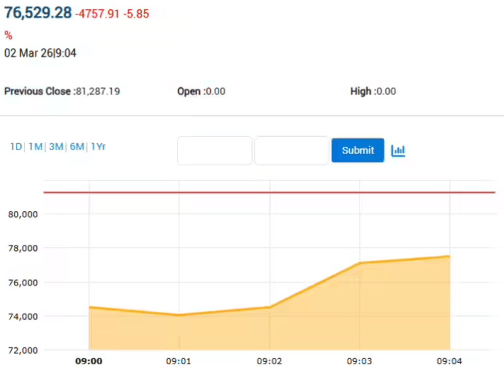 पश्चिम एशिया में बढ़ते भू-राजनीतिक तनाव, विदेशी पूंजी की निकासी और कमजोर कॉरपोरेट नतीजों के बीच सोमवार को भारतीय शेयर बाजार में सुबह के कारोबार में जोरदार बिकवाली देखने को मिली। शुरुआती सत्र में निवेशकों की जोखिम लेने की क्षमता घटने से बाजार पर भारी दबाव बना रहा। प्री-ट्रेडिंग के दौरान सेंसेक्स 2,743.46 अंक गिरकर 78,543.73 पर आ गया; निफ्टी 533.55 अंक गिरकर 24,645.10 पर पहुंच गया। शुरुआती कारोबार में रुपया अमेरिकी डॉलर के मुकाबले 24 पैसे गिरकर 91.32 पर आ गया।