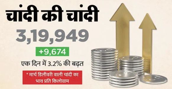 - चांदी की छलांग: मार्च डिलीवरी वाली चांदी का वायदा भाव 9,674 रुपये (3.2%) उछलकर 3,19,949 रुपये प्रति किलोग्राम के नए सर्वकालिक उच्च स्तरपर पहुंच गया।