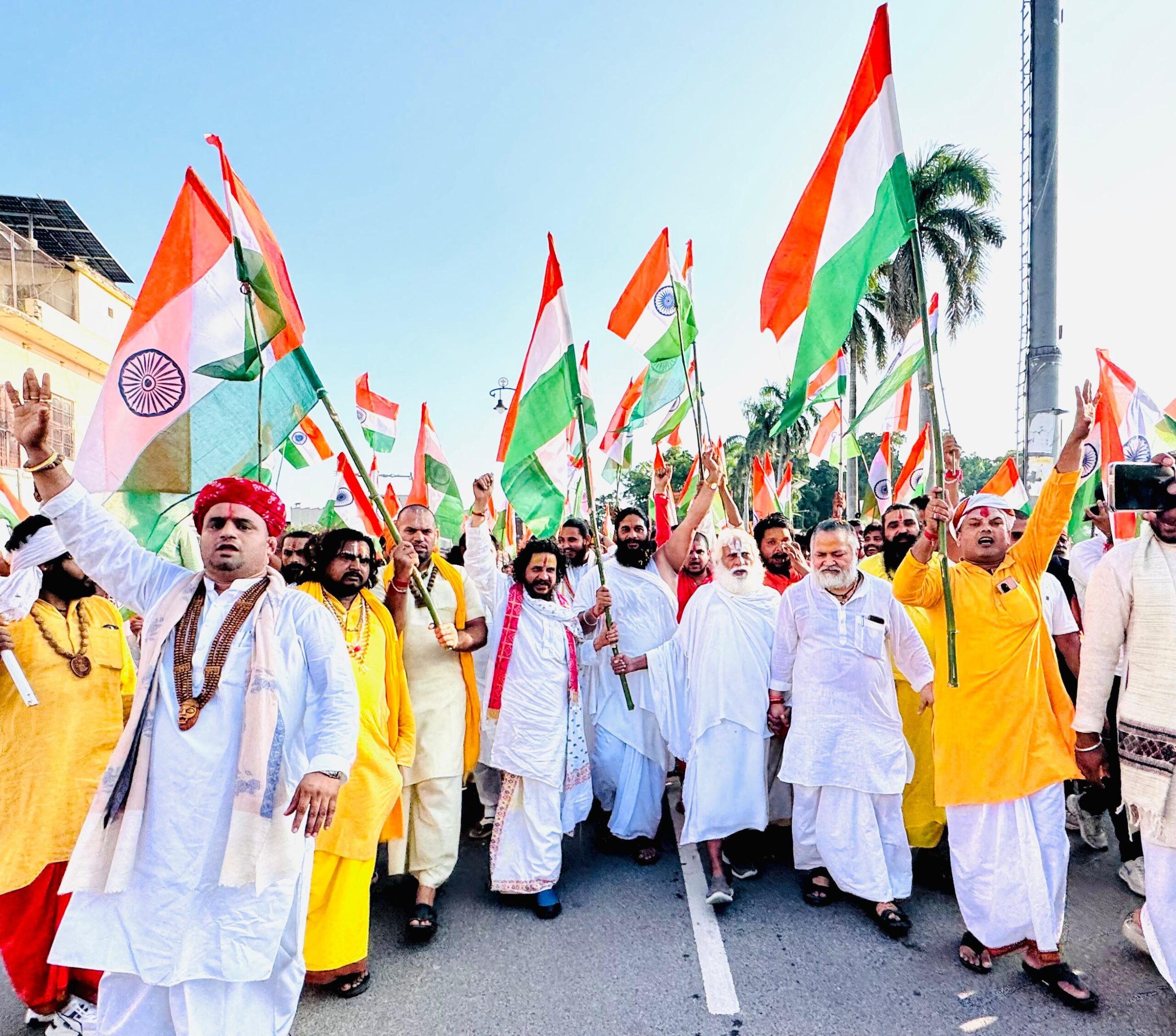 संकट मोचन सेना की भव्य तिरंगा यात्रा में उमड़ा साधु-संतों का जनसमूह अयोध्या। स्वतंत्रता दिवस की पूर्व संध्या पर हनुमानगढ़ी से संकट मोचन सेना के नेतृत्व में निकली भव्य तिरंगा यात्रा ने पूरे शहर को देशभक्ति के रंग में रंग दिया। हजारों की संख्या में साधु-संत, शिष्यगण और कार्यकर्ताओं के कदम से कदम मिलाते हुए तिरंगे की शान में जयघोष गूंजता रहा। यात्रा का नेतृत्व राष्ट्रीय अध्यक्ष-संकट मोचन सेना एवं निर्वाणी अनी के श्रीमहंत मुरली दास महाराज ने किया। इस अवसर पर डॉ. महेश दास महाराज, महंत राजेश दास महाराज पहलवान, बड़ा भक्तमाल पीठाधीश्वर महंत अवधेश कुमार दास महाराज, महापौर अयोध्या महंत गिरीशपति त्रिपाठी महाराज, खड़ेश्वरी मंदिर पीठाधीश्वर महंत दिलीप दास महाराज, करतलिया पीठाधीश्वर महंत रामदास बालयोगी महाराज, बड़े हनुमान पीठाधीश्वर महंत छबिराम दास महाराज, नागा जयमंगल दास महाराज, पहलवान मनीराम दास, पुजारी राजन दास, विराट दास, अभिषेक दास, व्यापारी नेता नन्दलाल गुप्ता, पंकज गुप्ता, सुरेश गुप्ता, अचल गुप्ता और विकास गुप्ता रसकुंज सहित सैकड़ों श्रद्धालु उपस्थित रहे। शहर की सड़कों पर तिरंगों की लहराती कतारें, गगनभेदी नारों और भजन-कीर्तन के स्वर के बीच निकली यह रैली अयोध्या में एकता, सद्भाव और राष्ट्रभक्ति का अद्भुत संगम बन गई।