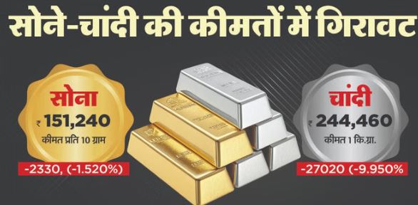 आज गुरुवार को सोना और चांदी की कीमतों में गिरावट दर्ज की जा रही है। एक झटके में चांदी जहां करीब 25000 रुपए प्रति किलो टूटी है तो सोने के भाव भी प्रति दस ग्राम 1800 रुपए सस्ता हुआ है।