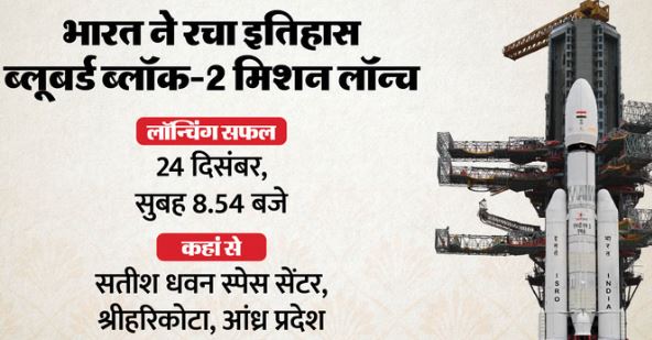 भारत का अंतरिक्ष अनुसंधान संस्थान (इसरो) इस साल के अपने आखिरी मिशन को सफलतापूर्वक लॉन्च कर इतिहास रच दिया । 24 दिसंबर (बुधवार) को भारतीय अंतरिक्ष एजेंसी ने अमेरिकी कंपनी एएसटी स्पेस मोबाइल के एक अहम सैटेलाइट को अंतरिक्ष में लॉन्च कर दिया है। एलवीएम3-एम6 मिशन के जरिए अमेरिकी कंपनी के कम्युनिकेशन सैटेलाइट ब्लूबर्ड ब्लॉक-2 को पृथ्वी की निचली कक्षा में स्थापित किया जाना है। यह इस रॉकेट की छठी ऑपरेशनल उड़ान (एलवीएम3-एम6) है।