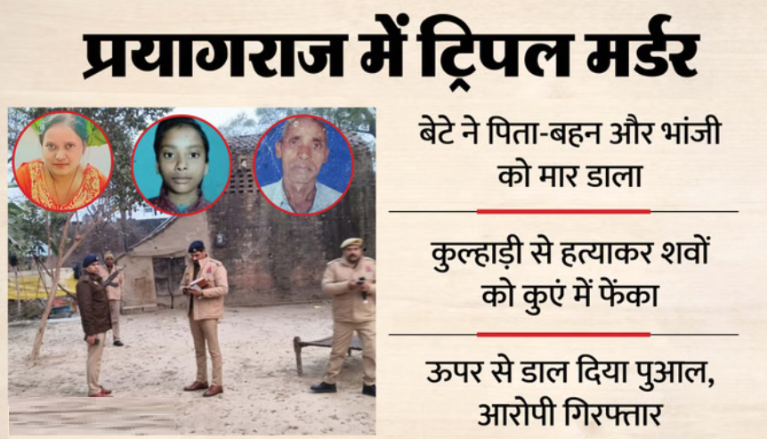 प्रयागराज के लोकापुर विशानी गांव में 10 बिस्वा जमीन के लिए बेटे ने पिता, बहन और भांजी की कुल्हाड़ी से प्रहार कर हत्या कर दी। वारदात के बाद तीनों शवों को एक कुएं में फेंक दिया और ऊपर से पुआल डाल दिया। सोमवार को आरोपी की गिरफ्तारी के बाद घटना का खुलासा हुआ।