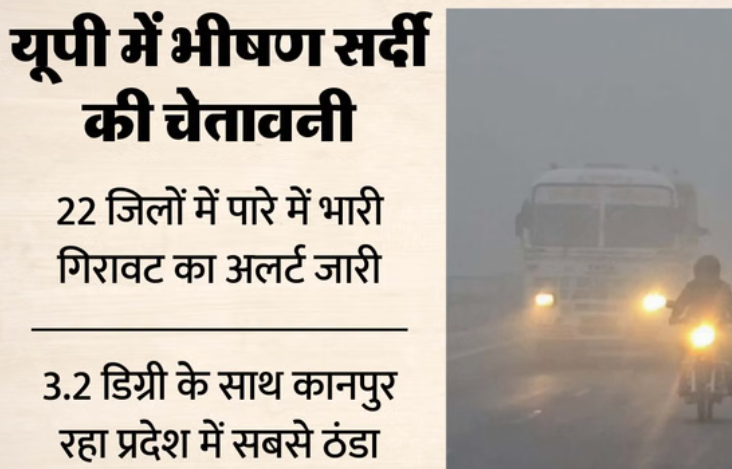 उत्तर प्रदेश में ठंड का कहर जारी है। रविवार को प्रदेश के पश्चिम व तराई के कई जिलों में कड़ाके की ठंड पड़ी। कोहरे के प्रकोप के साथ गलन भरी पछुआ ने लोगों की परेशानी बढ़ाई। जिन इलाकों में धूप हुई, वहां भी गलन हावी रही। कानपुर, इटावा, बाराबंकी, शाहजहांपुर, बरेली, हरदोई आदि जिलों में रात का तापमान 5 डिग्री या इससे नीचे दर्ज हुआ। 3.2 डिग्री न्यूनतम तापमान के साथ कानपुर प्रदेश में सबसे ठंडा रहा। माैसम विभाग ने सोमवार के लिए 13 जिलों में घने कोहरे का ऑरेंज अलर्ट जारी किया है। वहीं 22 जिलों में दिन के तापमान में भारी गिरावट यानी शीत दिवस होने की आशंका जताई है। आज स्कूल भी बंद रहेंगे।