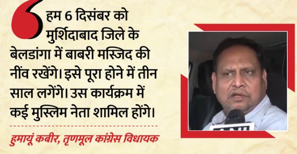 पश्चिम बंगाल की सत्ताधारी पार्टी टीएमसी के एक विधायक ने दावा किया है कि 6 दिसंबर को मुर्शिदाबाद के बेलडांगा में बाबरी मस्जिद की नींव रखी जाएगी, जिसमें कई मुस्लिम नेता शामिल होंगे। उन्होंने कहा कि इस मस्जिद के निर्माण में तीन साल का समय लगेगा। टीएमसी विधायक के इस बयान पर राजनीतिक घमासान शुरू हो गया है। टीएमसी विधायक के बयान पर भाजपा ने कड़ी प्रतिक्रिया दी है और इसे टीएमसी की तुष्टिकरण और धर्म की राजनीति करार दिया।