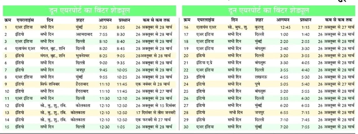देहरादून एयरपोर्ट के लिए विंटर शेड्यूल जारी कर दिया गया, जिसमें विभिन्न विमानन कंपनियों को 11 शहरों के लिए कुल तीस उड़ानों को मंजूरी मिली है। यह विंटर शेड्यूल 26 अक्तूबर से अगले वर्ष 28 मार्च तक लागू रहेगा।